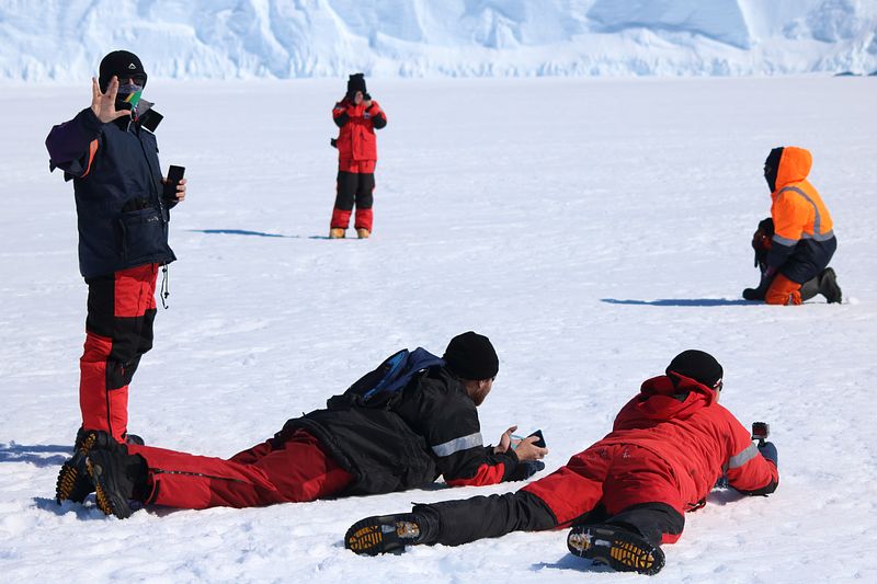I like to think it was for this reason that our captain took pity on us poor ship-based passengers a few weeks later. With most of the passengers and construction workers off to the base, the captain decided we and the crew deserved a chance to stretch our legs and parked the ship on some thick bay ice close by. It was like letting out the pre-schoolers and I don’t know who was more excited, us or the penguins. The most common penguins found in these bay ice areas are the Adélie penguins. With a reputation for being clumsy on land, we did not expect what was coming to us. As soon as the first basket of people was lowered onto the ice, they launched their assault, running towards the ship and people. They are intensely curious and have a secret speed weapon. They were allowed to inspect you all they wanted to, but as soon as you approached them, they would fall onto their bellies and slide away very fast, using their feet as propulsion. It was optimal selfie time and with the blood red ship in the background, the sparkling white ice and the blue-white icebergs, no one needed a filter. We spent our time playing cricket on the ice, with the penguins fielding. We also had the great luck of seeing some Emperor penguins. They are much taller than their cousins, about 80cm tall.. Being royalty, the Emperors were much less interested in our activities and lounged about, basking in the sun and occasionally taking plunge into the icy waters.